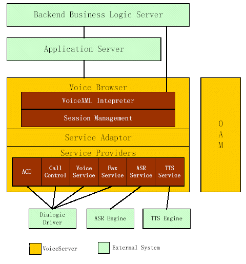 服務(wù)器應(yīng)用于動態(tài)腳本。對于動態(tài)腳本,ASP、JSP、PHP等任何用于動態(tài)產(chǎn)生HTML腳本的技術(shù)均適用于VoiceXML。對于動態(tài)腳本,應(yīng)用服務(wù)器還負(fù)責(zé)與后臺業(yè)務(wù)邏輯服務(wù)器接口。