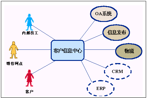 客戶信息中心有兩個層次的含義,首先它是一個信息中心,它應(yīng)該可以訪問到后臺現(xiàn)有的各種系統(tǒng),如OA系統(tǒng)、信息發(fā)布系統(tǒng)、物流系統(tǒng),同時它還應(yīng)該有良好的擴(kuò)展性,可以和未來的其它系統(tǒng)相銜接,比如CRM系統(tǒng)、ERP系統(tǒng)相接;其次它是一個圍繞客戶的信息中心,它應(yīng)該為客戶提供方便的信息交流手段,這就要求我們能夠通過多種媒介實現(xiàn)信息交互。