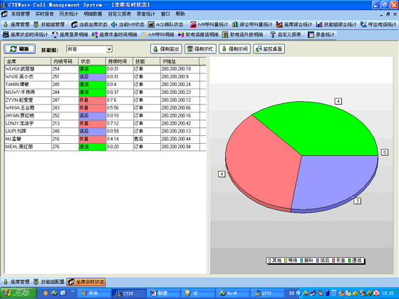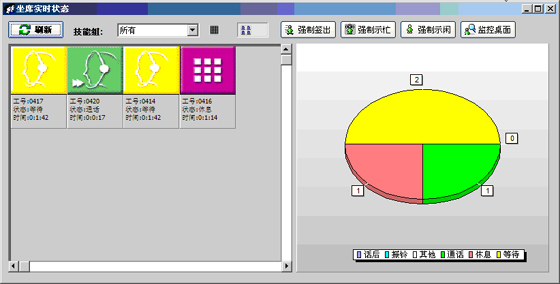 當(dāng)前座席狀態(tài):能夠提供座席的狀態(tài)表示,狀態(tài)持續(xù)時(shí)間,對應(yīng)的技能組,對應(yīng)的分機(jī)號(hào)碼,對應(yīng)的IP地址等信息?梢詫θ魏我粋(gè)座席進(jìn)行強(qiáng)制簽出、強(qiáng)制示忙、強(qiáng)制示閑操作?梢詫θ我庾M(jìn)行屏幕監(jiān)控操作(無需任何第三方軟件)。
