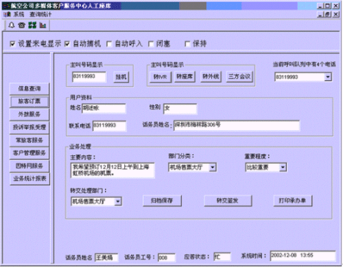 。。客戶(hù)打入電話(huà)后,當(dāng)系統(tǒng)的自動(dòng)語(yǔ)音應(yīng)答子系統(tǒng)無(wú)法解決客戶(hù)問(wèn)題時(shí),客戶(hù)可選擇人工服務(wù),由航空公司客戶(hù)服務(wù)代表直接接聽(tīng)客戶(hù)電話(huà),處理并解決客戶(hù)問(wèn)題。此時(shí)客戶(hù)同座席話(huà)務(wù)人員直接溝通,并同時(shí)記錄下該客戶(hù)的聯(lián)系方式,將相關(guān)數(shù)據(jù)添加入系統(tǒng)數(shù)據(jù)庫(kù);也可以在數(shù)據(jù)庫(kù)的支持下回答機(jī)場(chǎng)航班/航空貨運(yùn)信息及相關(guān)規(guī)定等的咨詢(xún)和疑問(wèn)、訂座/訂艙?蛻(hù)也可以選擇自動(dòng)語(yǔ)音服務(wù)方式,根據(jù)系統(tǒng)的語(yǔ)音提示輸入按鍵,選擇類(lèi)別,將自己的投訴和建議以及自己的聯(lián)系方式信息以留言錄音的方式保存在系統(tǒng)中。系統(tǒng)同時(shí)還支持自動(dòng)傳真方式,客戶(hù)可以通過(guò)傳真機(jī)進(jìn)入本系統(tǒng),通過(guò)按鍵選擇傳真方式,將自己的意見(jiàn)建議等的文本內(nèi)容傳真給系統(tǒng),系統(tǒng)自動(dòng)接受并存入數(shù)據(jù)庫(kù)。