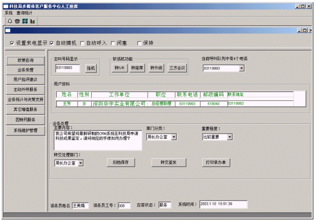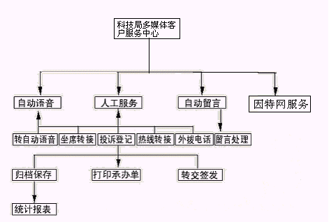 企業(yè)或個人打入電話后,可以選擇人工服務,同座席話務人員直接溝通,由話務人員將企業(yè)或個人反映的問題和提出的建議意見記錄下來,并同時記錄下該客戶的聯(lián)系方式,將相關數(shù)據(jù)添加入系統(tǒng)數(shù)據(jù)庫;也可以在數(shù)據(jù)庫的支持下回答企業(yè)或個人對科技成果和政策法規(guī)的咨詢和疑問。企業(yè)或個人也可以選擇自動語音服務方式,根據(jù)系統(tǒng)的語音提示輸入按鍵,選擇類別,將自己的投訴和建議以及自己的聯(lián)系方式信息以留言錄音的方式保存在系統(tǒng)中。系統(tǒng)同時還支持自動傳真方式,企業(yè)或個人可以通過傳真機打通客戶服務中心,通過按鍵選擇傳真方式,將自己的意見建議等的文本內(nèi)容傳真給系統(tǒng),系統(tǒng)自動接受并存入數(shù)據(jù)庫。