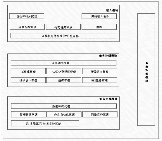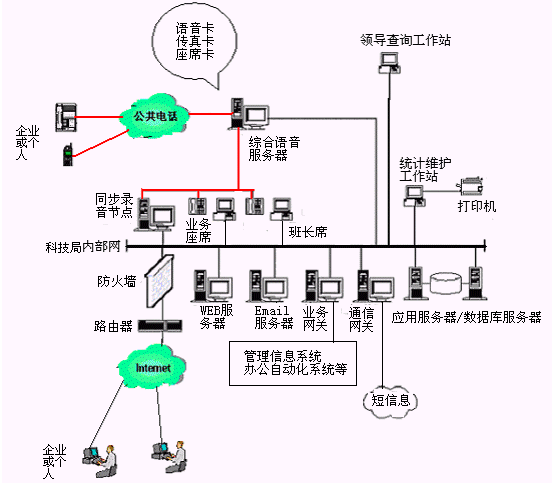 該系統(tǒng)的設計采用先進的三層CLIENT/SERVER網(wǎng)絡體系結(jié)構(gòu),集目前先進的計算機技術(shù)、通信技術(shù)、計算機電信集成(CTI)技術(shù)、多媒體呼叫接入技術(shù)、智能接入交換分配技術(shù)、數(shù)字語音處理技術(shù)、異構(gòu)系統(tǒng)信息交互技術(shù)、INTERNET網(wǎng)絡技術(shù)、安全容錯技術(shù)、網(wǎng)絡組網(wǎng)技術(shù)等于一體,并與地方科技局已有技術(shù)支持系統(tǒng)(如MIS系統(tǒng)、辦公自動化系統(tǒng)等)緊密結(jié)合在一起,突破時空的限制,通過人工座席、自動語音/傳真、科技局相關人員等為企業(yè)或個人提供電話、傳真、電子郵件、因特網(wǎng)、手機、網(wǎng)絡電話等多種服務形式的周到、快捷、全方位的服務,為企業(yè)或個人與地方科技局之間架起一座密切聯(lián)系的橋梁。