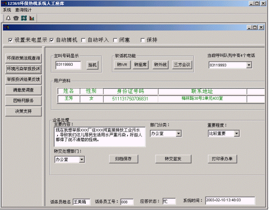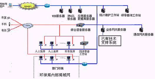 該系統(tǒng)利用環(huán)保局現(xiàn)有的信息網(wǎng)絡資源,將自動語音查詢、人工服務、信息資料處理緊密結(jié)合起來,為人民群眾提供全天候24小時不間斷的優(yōu)質(zhì)服務。