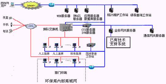 該12369環(huán)保熱線系統(tǒng)主要是由具有排隊功能的交換機或帶語音板卡的工控機、CTI服務器、IVR(交互式語音應答)/IFR(交互式傳真應答)子系統(tǒng)、人工座席子系統(tǒng)、應用服務器、數(shù)據(jù)庫服務器、業(yè)務網(wǎng)關(guān)子系統(tǒng)、通信網(wǎng)關(guān)子系統(tǒng)等硬件設備和應用軟件組成。