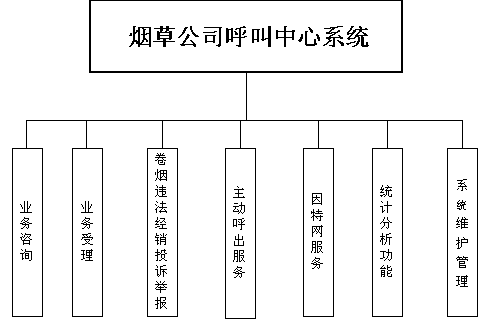 卷煙經(jīng)銷(xiāo)戶(hù)等客戶(hù)利用電話(huà)、傳真、電子郵件、因特網(wǎng)、手機(jī)、短消息等撥打統(tǒng)一的特服號(hào)碼(如800XXX或9XXXX)進(jìn)入煙草公司呼叫中心,本系統(tǒng)依托煙草公司各類(lèi)業(yè)務(wù)技術(shù)支持系統(tǒng)和網(wǎng)絡(luò)系統(tǒng),實(shí)現(xiàn)煙草專(zhuān)賣(mài)局原有管理系統(tǒng)/業(yè)務(wù)系統(tǒng)及數(shù)據(jù)庫(kù)的無(wú)縫連接,通過(guò)人工受理或自動(dòng)語(yǔ)音服務(wù)等方式全天24小時(shí)不間斷地為客戶(hù)提供各種服務(wù)。