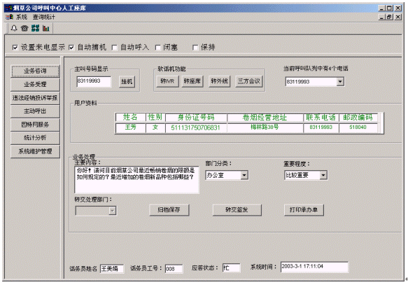 煙草公司呼叫中心將接入功能、導(dǎo)航功能、自動(dòng)語(yǔ)音查詢(xún)功能、人工座席服務(wù)功能、話(huà)路轉(zhuǎn)接功能、信息資料處理緊密聯(lián)系起來(lái)。用戶(hù)撥打特服電話(huà)號(hào)碼后,可以根據(jù)需要選擇人工服務(wù)、自動(dòng)語(yǔ)音查詢(xún)、自動(dòng)留言,并能夠在幾種服務(wù)中來(lái)回切換或轉(zhuǎn)接其它電話(huà);所記錄的資料可以分門(mén)別類(lèi)的進(jìn)行統(tǒng)計(jì)并形成報(bào)表,供相關(guān)部門(mén)進(jìn)行檢索查閱;意見(jiàn)處理完畢,可由座席主動(dòng)呼叫用戶(hù),告知處理意見(jiàn),形成閉環(huán)處理流程。