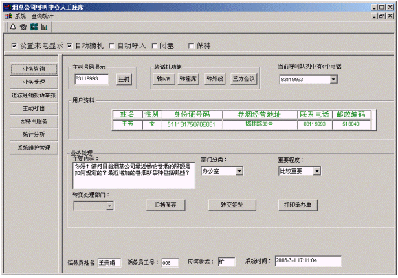 客戶打入電話后,當(dāng)系統(tǒng)的自動(dòng)語(yǔ)音應(yīng)答子系統(tǒng)無(wú)法解決客戶問題時(shí),客戶可選擇人工服務(wù),由客戶服務(wù)代表直接接聽客戶電話,處理并解決客戶問題。此時(shí)客戶同座席話務(wù)人員直接溝通,并同時(shí)記錄下該客戶的聯(lián)系方式,將相關(guān)數(shù)據(jù)添加入系統(tǒng)數(shù)據(jù)庫(kù);也可以在數(shù)據(jù)庫(kù)的支持下處理傳真業(yè)務(wù),電子郵件,計(jì)算機(jī)文件傳輸、滿意度調(diào)查等。