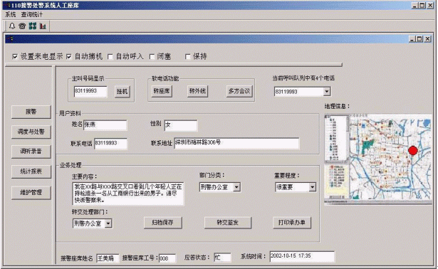 公安局110無線報(bào)警定位調(diào)度系統(tǒng)將認(rèn)真處理每次報(bào)警呼叫,并提供智能路由選擇、電話外撥、預(yù)計(jì)客戶等待時(shí)間、屏幕彈出、呼叫和客戶數(shù)據(jù)以及操作界面同步轉(zhuǎn)移、因特網(wǎng)服務(wù)等先進(jìn)功能,大大提高公安局的響應(yīng)速度和形象。同時(shí),還實(shí)現(xiàn)客戶信息的集中管理,提供業(yè)務(wù)統(tǒng)計(jì)和呼叫統(tǒng)計(jì)分析等功能,通過客戶的相關(guān)信息為客戶提供個(gè)性化服務(wù),確保每個(gè)呼叫的處理都能滿足的特定需求,同時(shí)能自動對所有客戶的呼入過程及操作內(nèi)容進(jìn)行量化處理,生成報(bào)表,作為管理依據(jù),以幫助公安局領(lǐng)導(dǎo)實(shí)現(xiàn)決策分析。