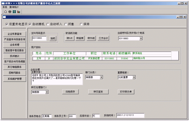 (2)提高家電企業(yè)親切感:系統(tǒng)在人工服務(wù)狀態(tài)下,當業(yè)務(wù)代表輸入客戶名稱時,系統(tǒng)即時將客戶與家電企業(yè)相關(guān)的信息顯示在座席終端上,使業(yè)務(wù)及時了解客戶,有針對性回答客戶問題,使客戶倍感親切。