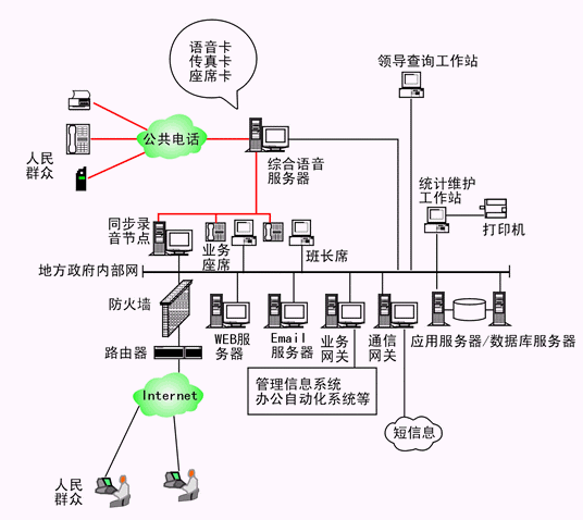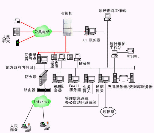 本系統(tǒng)物理結(jié)構(gòu)由帶語(yǔ)音板卡的工控機(jī)或排隊(duì)交換機(jī)、座席分流器、CTI服務(wù)器、IVR(交互式語(yǔ)音應(yīng)答)/IFR(交互式傳真應(yīng)答)服務(wù)器、業(yè)務(wù)代表座席、班長(zhǎng)座席、統(tǒng)計(jì)維護(hù)管理工作站、因特網(wǎng)(WEB)服務(wù)器、電子郵件(EMAIL)服務(wù)器、數(shù)據(jù)庫(kù)/應(yīng)用服務(wù)器、業(yè)務(wù)網(wǎng)關(guān)服務(wù)器、錄音留言工作站、領(lǐng)導(dǎo)查詢工作站、網(wǎng)絡(luò)系統(tǒng)等構(gòu)成。