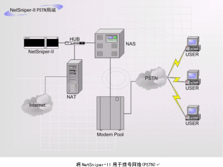 上圖中,NetSniper-II可以對(duì)網(wǎng)絡(luò)內(nèi)部各用戶進(jìn)行檢測(cè),一旦發(fā)生某個(gè)用戶安裝代理服務(wù)器軟件,其他用戶通過(guò)該用戶的接口上網(wǎng)偷逃網(wǎng)費(fèi)的情況,或發(fā)現(xiàn)盜用MAC地址上網(wǎng)及通過(guò)Modem回?fù)苌暇W(wǎng)的情況,NetSniper-II即可定位這些用戶,并且采取通知系統(tǒng)管理員或自動(dòng)封堵非法用戶等措施。
