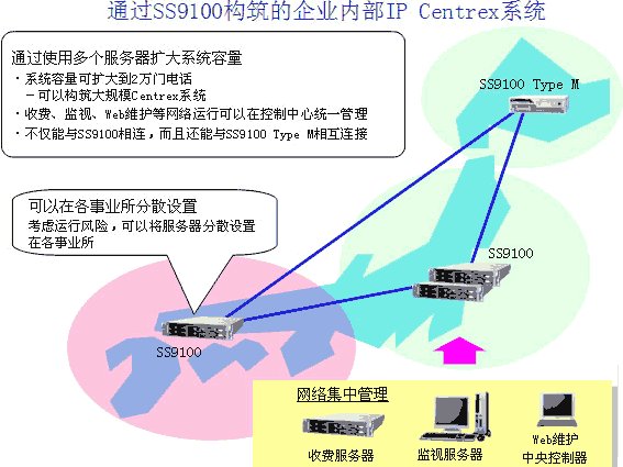 多個SS9100服務(wù)器相互協(xié)作,擴(kuò)大了系統(tǒng)整體容量。以往模型由1個服務(wù)器構(gòu)成,系統(tǒng)最大只能容納5千門電話,而SS9100 R5可以構(gòu)筑將系統(tǒng)整體容量擴(kuò)展到容納2萬門電話的大規(guī)模Centrex系統(tǒng)。進(jìn)而,通過將服務(wù)器分散設(shè)置在各事業(yè)所的形式,可以考慮分散各事業(yè)所之間故障危險(xiǎn)的基礎(chǔ)上構(gòu)筑系統(tǒng)。