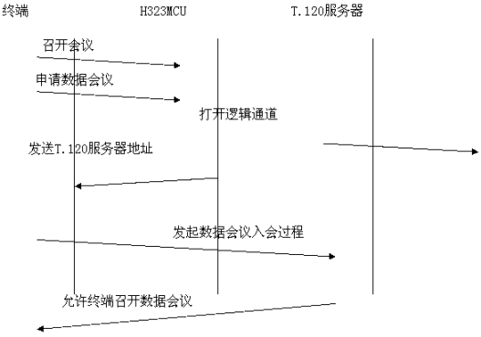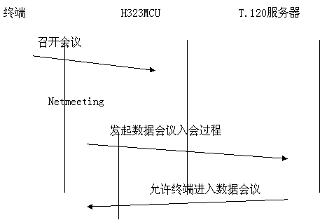 采用帶外方式,數(shù)據(jù)與音頻視頻流分開,各自占用帶寬。與終端和MCU無(wú)任何關(guān)系。如果用戶想召開數(shù)據(jù)會(huì)議,需要單獨(dú)的一臺(tái)PC機(jī)來(lái)進(jìn)行數(shù)據(jù)的接受與傳送,所有需要數(shù)據(jù)會(huì)議功能的用戶的PC機(jī)都連接到一個(gè)T.120服務(wù)器上。目前常用的終端軟件是Netmeeting軟件。數(shù)據(jù)占用單獨(dú)的帶寬,不擠占音視頻的帶寬。會(huì)議建立過(guò)程為: