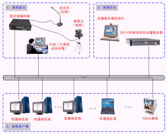 如上圖,DSS-R多媒體實(shí)時(shí)錄播系統(tǒng)主要由以下三部分組成: