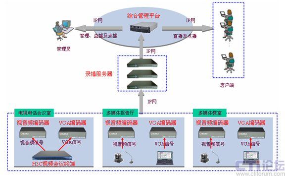 課易錄—銳取多媒體錄播系統(tǒng),是深圳市銳取軟件技術(shù)有限公司自主研發(fā)的最新一代的多媒體錄播系統(tǒng)。該系統(tǒng)基于IP網(wǎng)絡(luò),可以將教學(xué)中的視頻、音頻信號(hào)和計(jì)算機(jī)動(dòng)態(tài)屏幕信號(hào)進(jìn)行一體化的同步錄制、直播。相對(duì)于傳統(tǒng)的視音頻錄播產(chǎn)品,課易錄在視音頻錄播的基礎(chǔ)上,創(chuàng)新地增加了對(duì)計(jì)算機(jī)動(dòng)態(tài)屏幕信號(hào)的錄制直播功能,該功能為全面記錄教學(xué)實(shí)況,即時(shí)生成多媒體教學(xué)課件提供了極大地方便,適合大中專院校,中小學(xué)等教育系統(tǒng)用戶用于課件制作、多媒體教學(xué)、會(huì)議報(bào)告錄制,尤其適合高等院校作為校園網(wǎng)多媒體教學(xué)直播平臺(tái)和(精品課程)課件制作工具使用。具體方案拓?fù)鋱D如下: