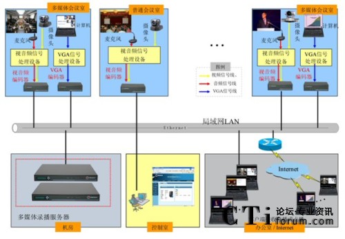 如上圖如圖所示,在兩間多媒體會議室內(nèi)配備了銳取多媒體錄播系統(tǒng)前端的視音頻編碼器和VGA編碼器,視音頻編碼器負責采集會議、培訓(xùn)中的視音頻信號,VGA編碼器負責采集幻燈片的VGA圖像內(nèi)容。其他普通會議室只使用視音頻編碼器采集視音頻信號。前端的編碼器采集信號并編碼后通過網(wǎng)絡(luò)發(fā)送給后端機房內(nèi)的銳取多媒體錄播服務(wù)器,多媒體錄播服務(wù)器接收多間會議室的信號進行組合錄制、直播、點播。