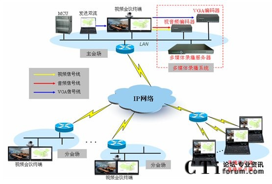 銳取多媒體錄播系統(tǒng)部署在中國(guó)疾控中心主會(huì)場(chǎng),通過(guò)視音頻編碼器及VGA編碼器采集視頻會(huì)議終端輸出的本地、遠(yuǎn)端會(huì)議及雙流圖像,并通過(guò)IP網(wǎng)絡(luò)將采集的信號(hào)編碼后發(fā)送給位于機(jī)房的多媒體錄播服務(wù)器,由服務(wù)器實(shí)現(xiàn)視頻會(huì)議的錄制、直播、點(diǎn)播。分會(huì)場(chǎng)及不具備視頻會(huì)議設(shè)備的會(huì)議可通過(guò)IE瀏覽器訪問(wèn)多媒體錄播服務(wù)器,接收會(huì)議的實(shí)時(shí)直播或進(jìn)行事后點(diǎn)播。