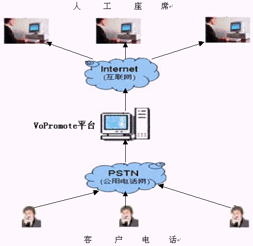 VoPromote語音平臺是基于W3C組織制定的VoiceXML標準開發(fā)的語音平臺。它對各個功能模塊的實現(xiàn)技術要求低且與國際標準兼容,在此基礎上再添VOIP功能更是如虎添翼。其VOIP工作模式圖如下: