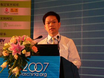 下圖為普天東方通信股份有限公司交換網(wǎng)絡(luò)事業(yè)部副總經(jīng)理張勝作主題為“融合型業(yè)務(wù)網(wǎng)絡(luò)和電信級增值平臺”的演講。