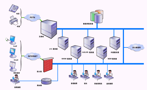 SmartCon呼叫中心由數(shù)字程控交換機(或中繼板卡)、計算機電話集成服務器(SmartCTI)、交互式語音/傳真應答服務器(SmartIVR/IFR)、多通道數(shù)字錄音服務器(SmartMDR)、自動呼叫分配服務器(SmartACD)、地理信息系統(tǒng)服務器(SmartGIS)、Email服務器、座席終端系統(tǒng)(SmartAgent)、業(yè)務統(tǒng)計管理子系統(tǒng)、系統(tǒng)安全管理子系統(tǒng)、數(shù)據(jù)庫服務器等組成,其中交換機又可作為本單位內部電話交換機使用。系統(tǒng)的網(wǎng)絡結構示意圖如下:
