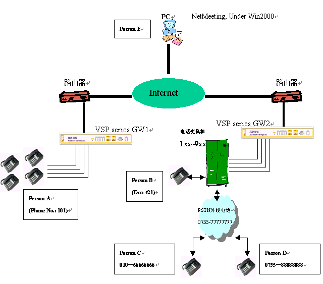 1、 兩臺語音網(wǎng)關,分別為 GW1 和GW2,與另外一臺電腦同時連接在internet上。