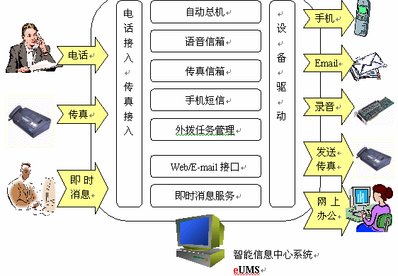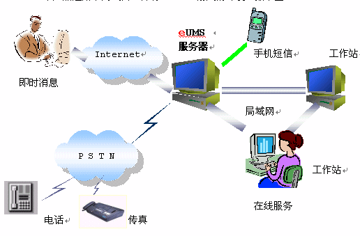 整個(gè)系統(tǒng)以eUMS服務(wù)器為核心,對(duì)內(nèi)連接企業(yè)局域網(wǎng),對(duì)外連接互聯(lián)網(wǎng)。eUMS內(nèi)配置一塊語(yǔ)音/傳真卡,負(fù)責(zé)電話、傳真的接入。如果企業(yè)需要自己的短信服務(wù),也可以在eUMS服務(wù)器上安裝手機(jī)短信網(wǎng)關(guān),外接一部手機(jī)即可。