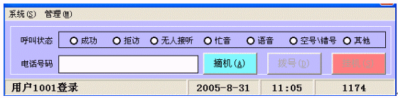 - 坐席功能,坐席人員通過電腦鼠標(biāo)操作,取新客戶資料,點擊撥號,同時,用鼠標(biāo)操作記錄撥號過程和通話過程的一些設(shè)置(撥號成功、忙線、無人接、客戶反饋信息等)。坐席電腦將分類顯示忙線電話列表、無人接電話列表、感興趣客戶列表等信息,以便做下一輪撥號參考。