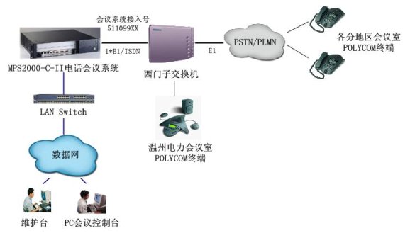 MPS2000-C電話(huà)會(huì)議系統(tǒng)通過(guò)數(shù)字中繼(采用ISDN信令)與溫州電力原有的西門(mén)子交換機(jī)互聯(lián),作為會(huì)議應(yīng)用服務(wù)器,為溫州電力原有電話(huà)網(wǎng)絡(luò)內(nèi)的用戶(hù)提供電話(huà)會(huì)議功能。