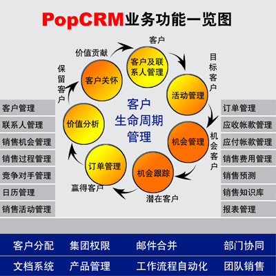PopCRM吸收了國內(nèi)外先進(jìn)的管理思想,以客戶的需求為根本,以應(yīng)用價(jià)值為核心,聚焦銷售環(huán)節(jié),對(duì)客戶資源統(tǒng)一管理,規(guī)范銷售行為;對(duì)銷售進(jìn)行分析預(yù)測(cè),提供決策依據(jù);對(duì)客戶進(jìn)行全面分析,提供客戶關(guān)懷,吸引并留住客戶,全面提高企業(yè)的盈利能力。