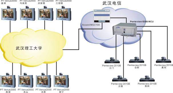武漢理工大學的遠程教學系統(tǒng)由于分3期建設,網(wǎng)絡條件較為復雜。一期主要以PT的Venue2000終端+Accord MGC100 MCU為主,是一個H323系統(tǒng);二、三期采用中太多媒體的Penteview2010終端+Penteview6088MCU,是一個H320系統(tǒng),兩套系統(tǒng)通過網(wǎng)關無縫結合到一起工作,用戶根本感覺不到不同。各教室均同時采用了中太多媒體的遠程教學支撐系統(tǒng),通過對Penteview會議電視系統(tǒng)的擴充,實現(xiàn)了以下功能,使教學應用更加方便: