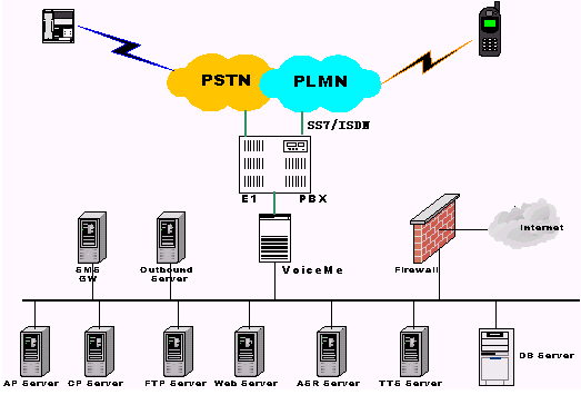 整個系統(tǒng)平臺前端接入可直接從電信或移動交換機提供的信號接入,如中國一號、SS7以及ISDN等,通過PBX連入平臺核心VoiceMe服務器,系統(tǒng)接入容量可擴至幾十個乃至上百個E1接入。系統(tǒng)主要包括語音控制、多媒體應用和內容管理等部分,其中主要包括: