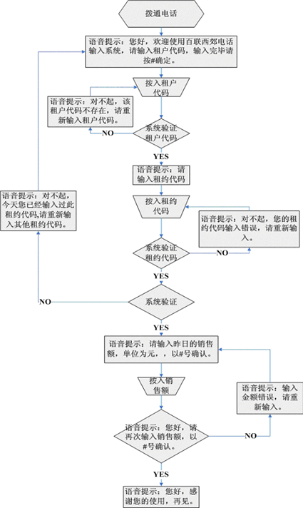 2) 系統(tǒng)每天從早上9:00--11:30為輸入工作時間,租戶在其它時間進(jìn)入本系統(tǒng)時,系統(tǒng)自動播放"輸入銷售數(shù)據(jù)時間已過,請您在每天早上9:00--11:30間登錄系統(tǒng),謝謝您的使用,再見!"系統(tǒng)每天只能錄入前一天的銷售數(shù)據(jù),并對此進(jìn)行提示。