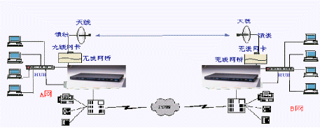A網(wǎng)與B網(wǎng)分別為兩個(gè)局域網(wǎng),通過兩臺(tái)WavePoint II無線網(wǎng)橋?qū)蓚(gè)局域網(wǎng)連在一起,網(wǎng)橋上的RJ45口或BNC細(xì)纜接口與局域網(wǎng)相連。每臺(tái)網(wǎng)橋上插有一塊WaveLAN無線PC卡,PC卡的射頻輸出端口,通過饋線接到天線,通過PC卡來完成無線鏈路的連通。無線網(wǎng)橋連接完成后的效果類似HUB級(jí)連。IP語音網(wǎng)關(guān)-HGW-904的局域網(wǎng)接口(RJ45)連接到局域網(wǎng)的HUB上,根據(jù)用戶實(shí)際的話務(wù)量,選用Line端口接入用戶電話交換機(jī)(PBX),PBX接普通電話機(jī)和傳真機(jī),并連接至電話公網(wǎng)(PSTN)。其中所需設(shè)備:HGW-904