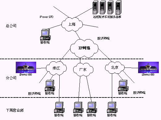 某證券公司有三級網(wǎng)絡(luò),總公司、分公司和下屬營業(yè)部?偣镜椒止編捠2M,在總公司配置一套會議室型電視會議終端POLYCOM 970和一套多點會議服務(wù)器Radvision ViaIP400。在分公司配置了38套會議室型電視會議終端POLYCOM 680,用于與總公司進行雙向視頻會議。分公司到營業(yè)部帶寬是512K,各營業(yè)部安裝遠程股評系統(tǒng)接收端程序,遠程股評系統(tǒng)服務(wù)器都放置在海通總公司。當在總公司進行股評時,總公司本地攝像頭拍攝教師畫面,MIC采集教師聲音,傳給服務(wù)器編碼,再通過網(wǎng)絡(luò)供各個接收端接收;當在分公司進行股評時,首先分公司的電視會議設(shè)備采集教師畫面及聲音傳回總公司的電視會議設(shè)備,再傳給遠程股評系統(tǒng)的服務(wù)器進行編碼,然后通過網(wǎng)絡(luò)發(fā)布,供接收端接收。(結(jié)構(gòu)如下圖)