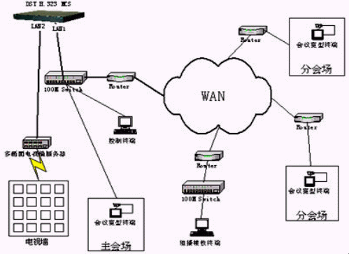 整個(gè)工程主會(huì)場(chǎng)設(shè)在泰州總部,另有遍布全國(guó)的46個(gè)分支機(jī)構(gòu)作為分會(huì)場(chǎng),在主會(huì)場(chǎng)設(shè)置多點(diǎn)控制設(shè)備(MCU)和電視墻設(shè)備,在所有會(huì)場(chǎng)都配置會(huì)議電視終端,組成春蘭集團(tuán)的基于H.323協(xié)議的視頻會(huì)議系統(tǒng)。