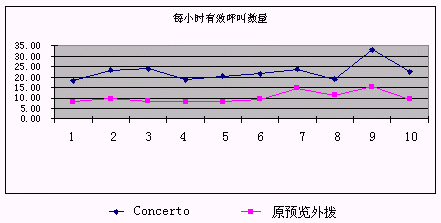下圖可以看出使用原預覽外撥和采用Concerto預測外撥系統后單位座席每小時有效呼叫數量的比較: