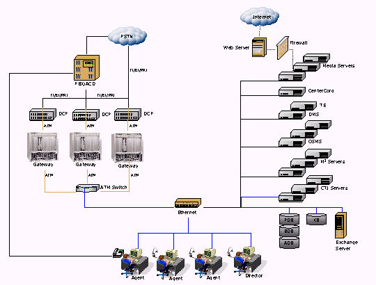 系統(tǒng)的中央設(shè)備包括DCP-Gateway Combo、ATM Switch、EnsemblePro服務(wù)器群以及外圍服務(wù)器群: