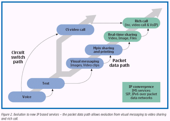 首個IP整合服務(例如視頻共享和內容共享)是向豐富的通話方式發(fā)展的關鍵。這是一個以語音、視頻和文本為形式的基于會話通訊的概念,它支持在會話參與者之間共享相同的內容,例如圖片、數據和其它增值信息。