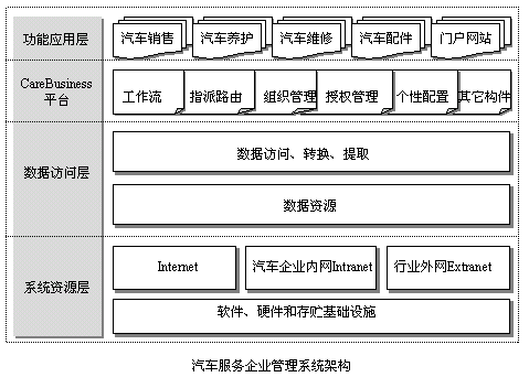 CareBusiness Suite主要包含了汽車銷售管理系統(tǒng)、汽車養(yǎng)護管理系統(tǒng)、汽車維修管理系統(tǒng)和汽車配件管理系統(tǒng)等系統(tǒng)模塊,這些系統(tǒng)及其系列模塊統(tǒng)一構(gòu)建于CareBusiness