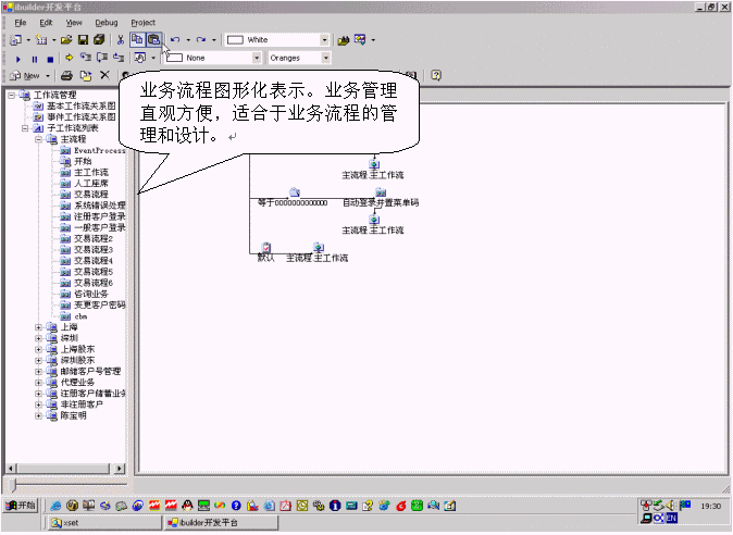 該產品通過將所有業(yè)務分別處于樹形化的節(jié)點上,可以直觀的對業(yè)務進行增加、刪除、修改的管理。增加子業(yè)務的時候,必須帶有業(yè)務類別,實現業(yè)務管理歸類化,避免業(yè)務管理的混亂。該產品還支持業(yè)務流程的樹形化表示,使業(yè)務流程開發(fā)者可以方便地了解業(yè)務流程的全局框架。
