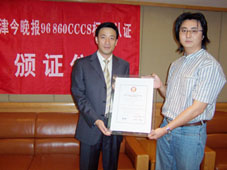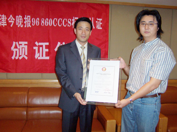 2004年9月9日,天津今晚報公眾服務中心通過了《全國呼叫中心運營績效標準》(CCCS-OP-2003)認證,并獲得由中國信息化推進聯(lián)盟客戶關(guān)系管理專業(yè)委員會頒發(fā)的認證證書(四星級客戶服務中心),成為國內(nèi)傳媒業(yè)首家通過此認證的呼叫中心。