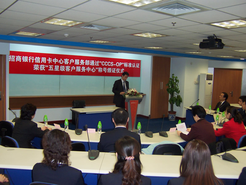 經(jīng)過長達8個月時間的準備和嚴格的認證審核,由中國信息化推進聯(lián)盟客戶關系管理專業(yè)委員會常務副主任郭晨東先生親自掛帥組成的項目評審專家小組從領導能力、戰(zhàn)略規(guī)劃與部署、客戶價值、績效衡量與分析、現(xiàn)場管理、人員管理、流程管理、運營績效結(jié)果等八個范疇對招商銀行信用卡中心客戶服務部進行了全面而嚴格的審核,涉及五大類上百項詳細的運營績效指標,歷經(jīng)初審評估、現(xiàn)場初審、初審評估報告提交與確認、標準試運行、績效全面提升、最終評審等階段,最終審核確認招商銀行信用卡中心客戶服務完全符合并部分超越《全國呼叫中心運營績效標準》(CCCS-OP-2003)的各項標準指標和要求,于2005年1月31日正式批準招商銀行信用卡中心通過該標準的五星級認證,授予“五星級客戶服務中心”稱號。