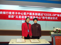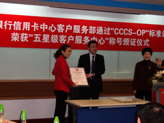 這天的上午10點30分,在招商銀行信用卡中心上海總部舉行了簡約而隆重的頒證儀式,信用卡中心常務副總經(jīng)理梁瑤蘭從信息產(chǎn)業(yè)部電子信息中心副主任、中國信息化推進聯(lián)盟秘書長劉獻軍手中接過證書,標志著國內(nèi)第一家五星級客戶服務中心誕生了!