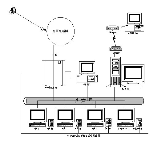 | ZQ-315電話(huà)投訴服務(wù)系統(tǒng)由如下各部分組成: 4呼叫排隊(duì)交換系統(tǒng) 4座席臺(tái) 4數(shù)據(jù)庫(kù)服務(wù)器 4系統(tǒng)維護(hù)管理臺(tái) 4同步數(shù)字錄音系統(tǒng) 4遠(yuǎn)程通訊模塊 4遠(yuǎn)程維護(hù)終端 各部分通過(guò)集線(xiàn)器和五類(lèi)雙絞線(xiàn)組成快速以太網(wǎng);各節(jié)點(diǎn)之間采用TCPAP協(xié)議,以 Socket方式進(jìn)行通訊。其組成結(jié)構(gòu)如下圖所示。 ![]() 1.呼叫排隊(duì)交換系統(tǒng) 4與公用電話(huà)網(wǎng)相連,將來(lái)話(huà)分配到座席臺(tái)或遇忙排隊(duì) 4自動(dòng)應(yīng)答來(lái)話(huà),完成自動(dòng)受理投訴與自動(dòng)查詢(xún)服務(wù) 4進(jìn)行呼叫轉(zhuǎn)移 2.座席臺(tái) 4人工應(yīng)答來(lái)話(huà) 4顯示主叫號(hào)碼、戶(hù)主與地址等信息(根據(jù)需要) 4計(jì)算機(jī)輔助投訴受理 4計(jì)算機(jī)輔助業(yè)務(wù)咨詢(xún)(法律。個(gè)案等) 3.?dāng)?shù)據(jù)庫(kù)服務(wù)器 4運(yùn)行網(wǎng)絡(luò)操作系統(tǒng) 4運(yùn)行數(shù)據(jù)庫(kù)系統(tǒng) 4提供各種數(shù)據(jù)服務(wù) 4對(duì)網(wǎng)絡(luò)安全性進(jìn)行檢查控制 4.系統(tǒng)維護(hù)管理臺(tái) 4對(duì)數(shù)據(jù)庫(kù)進(jìn)行維護(hù)管理 4查詢(xún)各種業(yè)務(wù)數(shù)據(jù),生成統(tǒng)計(jì)報(bào)表。 5.同步數(shù)字錄音系統(tǒng) 4將模擬話(huà)音轉(zhuǎn)換成數(shù)字信號(hào),并壓縮存儲(chǔ)。多路錄音,互不干擾 4支持多種語(yǔ)音數(shù)據(jù)壓縮格式(如PCMchDPCM、WAV等) 4播放放音 6.遠(yuǎn)程通訊模塊 4與上級(jí)或遠(yuǎn)程系統(tǒng)進(jìn)行通訊。 7.遠(yuǎn)程維護(hù)終端 4遠(yuǎn)程撥號(hào)登陸系統(tǒng),對(duì)系統(tǒng)進(jìn)行全面維護(hù) |