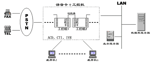 在一些小型CALL CENTER系統(tǒng)中,人們通常通過語音板卡加工控機的方式搭建系統(tǒng),通常一臺設(shè)備就集成了ACD、IVR、CTI等各種資源,各資源的使用、調(diào)派通過軟件進行控制,有效的解決了建設(shè)成本高、系統(tǒng)構(gòu)造繁復(fù)的問題,具有相當?shù)撵`活性。然而由于工控機和語音板卡容量有限,同時其標準最多只能是工業(yè)級標準,因此在構(gòu)建相對大型的呼叫中心時就總是捉襟見肘。為了增加系統(tǒng)容量,解決多臺PC之間進行通道交換的難題,人們又設(shè)計了過機卡和過機線來解決,其應(yīng)用系統(tǒng)如下圖: