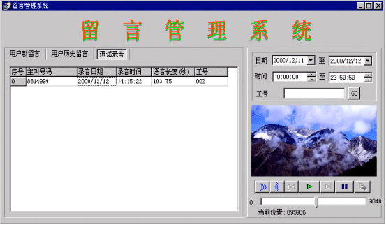 當(dāng)系統(tǒng)中無話務(wù)員登錄或等待超過20秒,則進(jìn)入語音信箱服務(wù)。語音信箱在進(jìn)入時(shí)提示用戶:“系統(tǒng)正忙,請留下您的聯(lián)系電話,復(fù)本機(jī)號請掛機(jī),復(fù)其他號碼請輸入電話號碼,按‘#’號鍵結(jié)束,或者在聽到‘嘟’的一聲之后留下你的留言”,當(dāng)主叫號碼位數(shù)不夠7位時(shí),提示:“系統(tǒng)正忙,請輸入您的聯(lián)系電話,按‘#’號鍵結(jié)束,或者在聽到‘嘟’的一聲之后留下你的留言”,系統(tǒng)將客戶留下的電話號碼記錄到數(shù)據(jù)庫中。將留言存放到一個指定目錄中,用話務(wù)號作為語音文件名。