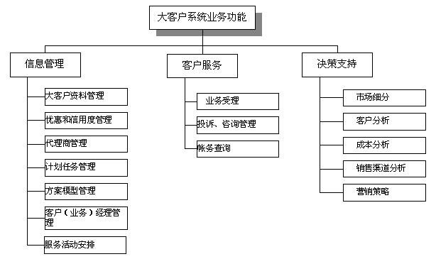 電信大客戶管理系統(tǒng)是在收集大客戶市場(chǎng)調(diào)查信息、大客戶資料信息、大客戶經(jīng)營(yíng)戰(zhàn)略資源的基礎(chǔ)上,自動(dòng)采集專業(yè)計(jì)費(fèi)、綜合營(yíng)帳、客服、網(wǎng)管、財(cái)務(wù)等系統(tǒng)的相關(guān)數(shù)據(jù),實(shí)現(xiàn)快速、全面、準(zhǔn)確的新客戶業(yè)務(wù)受理、新增需求受理及故障處理過(guò)程通道,實(shí)現(xiàn)完善的客戶經(jīng)理管理、代理商管理系統(tǒng),最終實(shí)現(xiàn)完整的大客戶滿意度評(píng)估體系和針對(duì)大客戶的個(gè)性化服務(wù)。建成后的系統(tǒng)從管理、服務(wù)、分析三方面出發(fā)主要應(yīng)具備信息管理、客戶服務(wù)、決策支持功能。