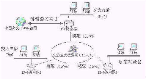 FH6501(IPv6路由器)已經(jīng)在北方交通大學(xué)學(xué)生IPv6實(shí)驗(yàn)床實(shí)際安全運(yùn)行了六個(gè)月。北方交通大學(xué)學(xué)生IPv6實(shí)驗(yàn)床采用我公司IPv6路由器產(chǎn)品,架構(gòu)了三個(gè)主節(jié)點(diǎn),借助隧道連接到由Nokia資助建設(shè)的中國(guó)高校IPv6實(shí)驗(yàn)床。目前三個(gè)主節(jié)點(diǎn)之間的連接是借助于學(xué)校原有的IPv4網(wǎng)絡(luò),通過(guò)隧道技術(shù)實(shí)現(xiàn)節(jié)點(diǎn)間的通信(見(jiàn)圖示)。