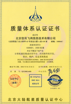 經(jīng)過近半年時間的建立和保持質量體系運行,佳訊飛鴻于在2002年3月順利的通過為期三天的嚴格審核,并重點對佳訊公司核心技術的CTI平臺進行審核。2002年4月2日通過了ISO國際組織的新體系標準ISO9001:2000的體系認證,取得了通過該標準的認證證書。佳訊飛鴻公司也成為國內第一家對CTI平臺進行審核并通過認證的公司。其完成標志著公司從成立之時起即嚴格遵循國際企業(yè)標準及現(xiàn)代企業(yè)管理模式,以軟件產(chǎn)品質量管理體系為載體,以客戶需求為導向。全面提高產(chǎn)品、服務質量,順應不斷變化的技術發(fā)展方向和市場變化,在質量、技術、成本和交期等方面全力滿足客戶需求,為客戶提供最佳性價比的產(chǎn)品和服務。