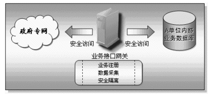 業(yè)務接入網(wǎng)關(guān)放置在每一個接入到本系統(tǒng)的部門或單位內(nèi),具有快速方便的異構(gòu)數(shù)據(jù)庫的連接能力,它主要完成兩個方面的功能,一方面實現(xiàn)本部門共享信息的對外發(fā)布,另一方面也通過核心的信息交換機實現(xiàn)其它相關(guān)部門的共享信息的采集工作。業(yè)務接口網(wǎng)關(guān)具有兩個網(wǎng)絡(luò)接口,一端連接本單位的內(nèi)部網(wǎng)絡(luò),另一端接入政府專網(wǎng)中。